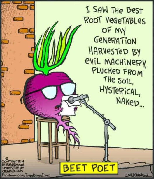 Цвекло поет. Ги видов најдобрите коренести зеленчуци на мојата генерација, ожнеани од злобни машини, искинати од почвата, хистерични, голи...