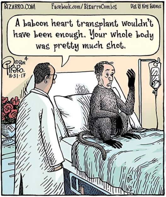 Трансплантација на срце од бабун не беше доволна. Целото твое тело беше крш.