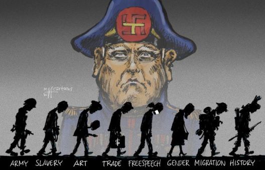 Секако, објаснете дека тоа не е еднократна, краткорочна трансформација. Нацијата прикажете ја како баталјон во воена зона, каде што непослушноста и поинаквото мислење се егзистенцијална закана за телото на заедницата. Објавете дека вашето движење планира процес на трајна милитаризација на општеството и побарајте огромен буџет за одбрана.