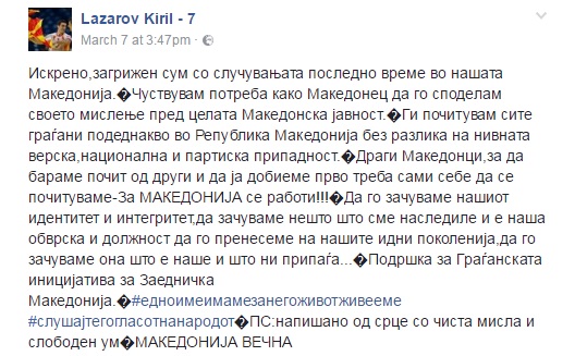 Многумина затоа се прашуваат: зошто му требаше овој излет?, иако за статусот Кире вели дека е напишан „од срце со чиста мисла и слободен ум“. Ги слушнал ли сите пораки на митингот? Допреа ли до него митингашките песни за „клетите Шиптари“? Ги виде ли снимките со нападите врз новинарите? Ќе остане ли спортистот чист штом дал поддршка на собирите на кои се извикува „чиста Македонија“?