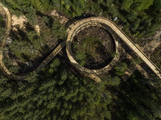 Како што патеката се издолжува, така структурните столбови ги потенцираат високите, цврсти дрвја на шумата, како да ѝ даваат знак на негодување на околината и традицијата на регионот на сеча на борови дрвја.